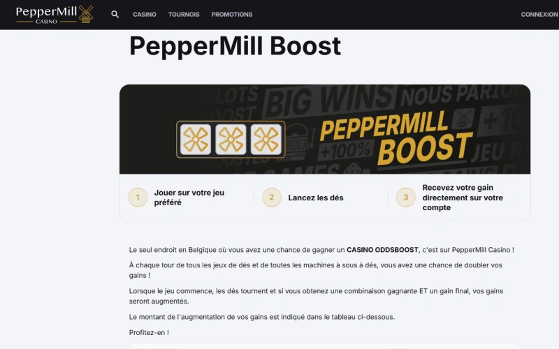 Les nouveaux joueurs belges peuvent profiter d’une offre généreuse lors de leur inscription. Cette promotion inclut un bonus de 100% sur le premier dépôt, pouvant atteindre jusqu’à 500€, accompagné de 50 tours gratuits sur une sélection de machines à sous populaires. Le bonus de bienvenue casino PepperMill est accessible à tous les nouveaux inscrits majeurs résidant en Belgique. Pour en bénéficier, un dépôt minimum de 20€ est requis, et des conditions de mise de 35x s’appliquent avant tout retrait.