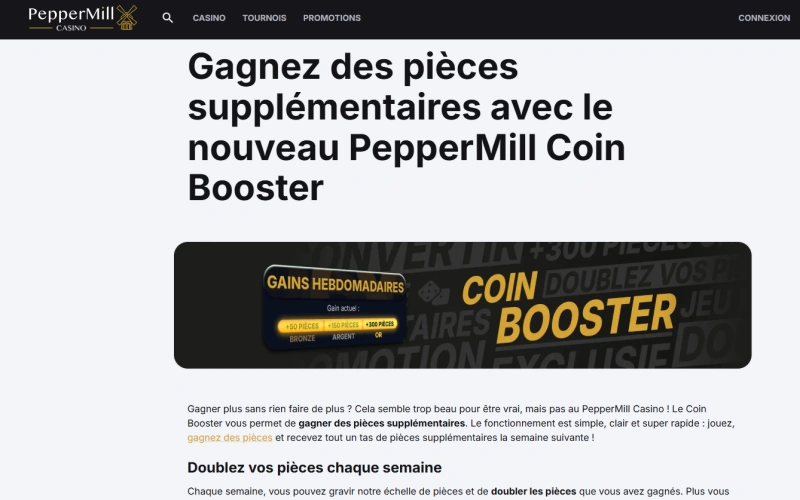 Un code promo est un outil pratique qui permet aux joueurs belges de débloquer des avantages exclusifs lors de leur inscription ou de leurs dépôts sur la plateforme. Le code promo casino PepperMill s’utilise généralement au moment de créer un compte ou d’effectuer un versement pour activer une offre spéciale.